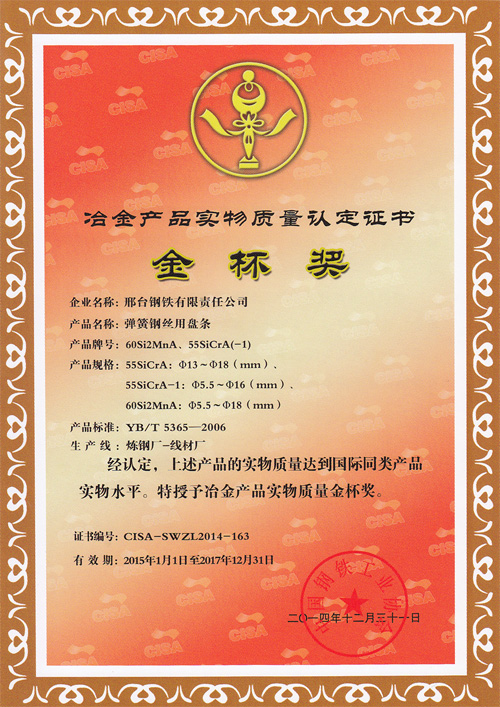 60Si2MnA、55SiCrA(-1) spring steel coil was awarded Gold Cup Prize of Metallurgic Products Quality