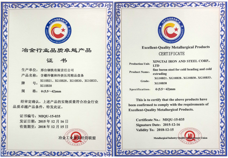 The φ5.5~42mm wire XG10B21、XG10B28、XG10B30、XG10B33、XG10B38 for cold heading and impacting with Boron awarded the superior quality product of Metallurgy Industry