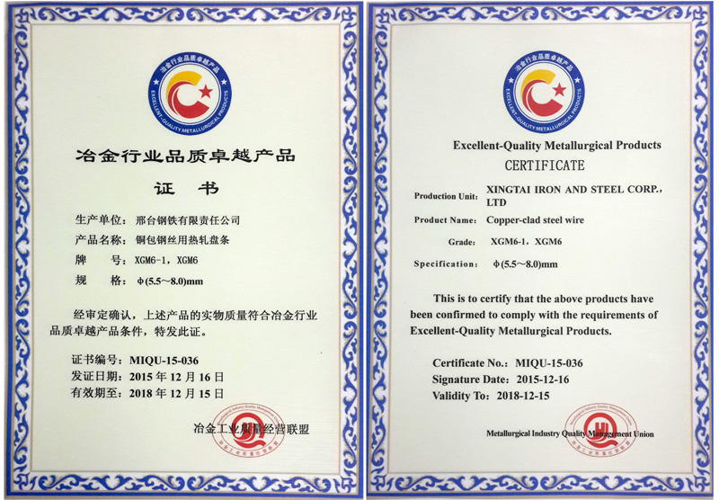 The φ5.5~8.0mm wire XGM6-1、XGM6 for coppered steel wire awarded the superior quality product of Metallurgy Industry