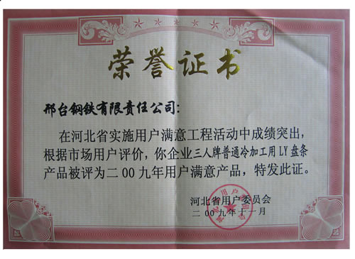 三人牌普通冷加工用LY盤條被評為2009年河北省用戶滿意產(chǎn)品