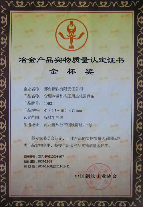 含硼冷鐓和冷擠壓用鋼盤條獲冶金產(chǎn)品實(shí)物質(zhì)量金杯獎