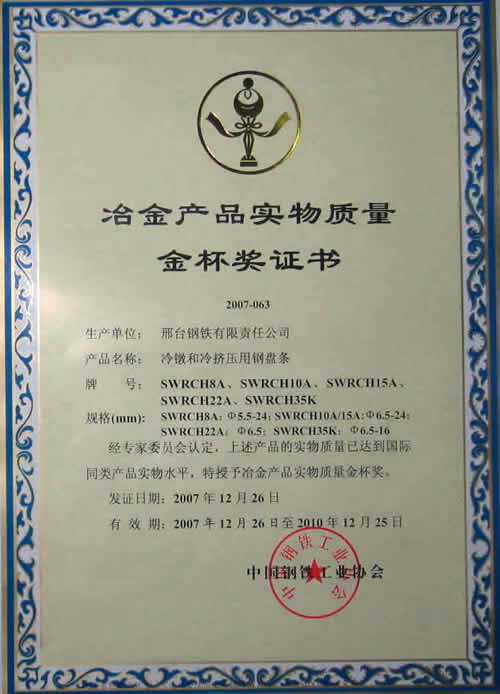 冷鐓和冷擠壓用鋼盤條SWRCH18A...SWRCH35K獲冶金產(chǎn)品實(shí)物質(zhì)量金杯獎