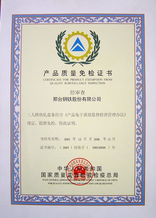 三人牌熱軋盤(pán)條產(chǎn)品質(zhì)量免檢證書(shū)