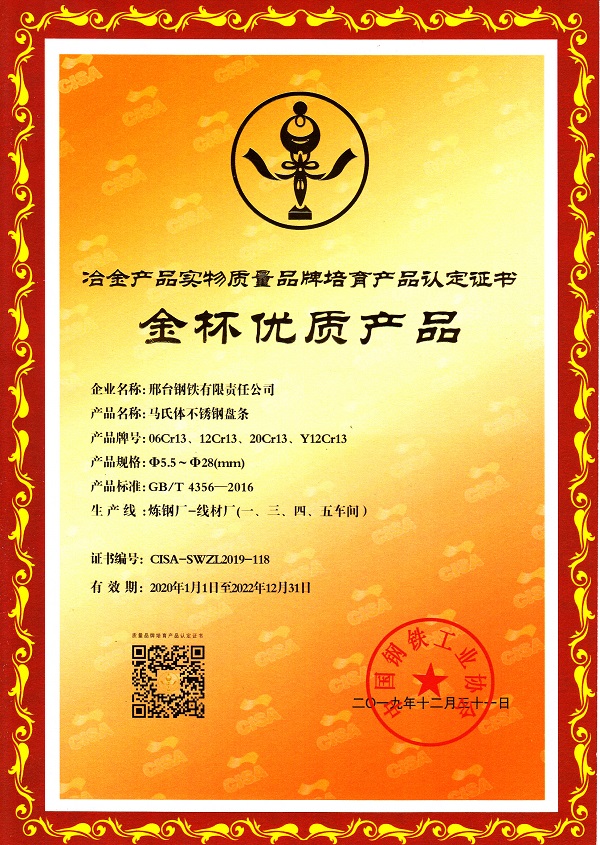 邢鋼馬氏體不銹鋼盤(pán)條06Cr13、12Cr13、20Cr13、Y12Cr13 φ5.5-28mm規(guī)格獲冶金產(chǎn)品實(shí)物質(zhì)量金杯優(yōu)質(zhì)產(chǎn)品認(rèn)定證書(shū)