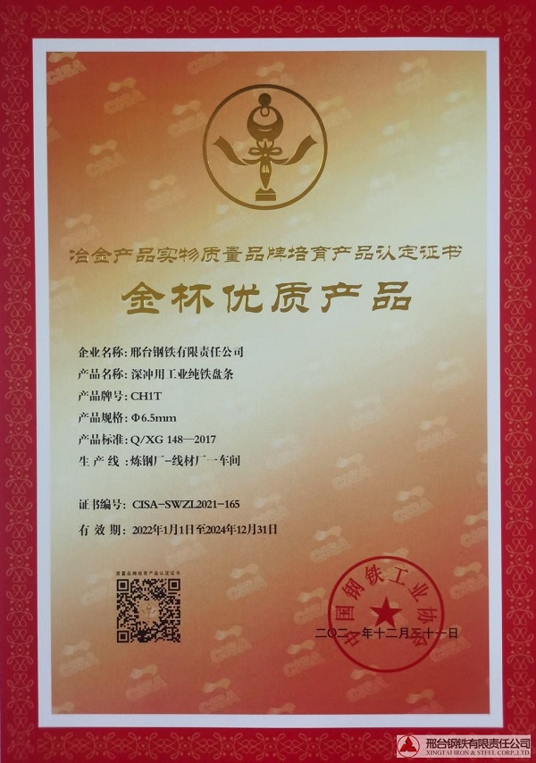 深沖用工業(yè)純鐵盤(pán)條CH1Tφ6.5mm規(guī)格獲冶金產(chǎn)品實(shí)物質(zhì)量金杯優(yōu)質(zhì)產(chǎn)品認(rèn)定證書(shū)