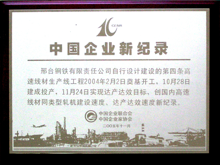 2005年11月,邢鋼自行設(shè)計(jì)建設(shè)的第四條高速線材生產(chǎn)線工程2004年2月2日奠基開(kāi)工,10月28日建成投產(chǎn),11月24日實(shí)現(xiàn)達(dá)產(chǎn)達(dá)效目標(biāo),創(chuàng)國(guó)內(nèi)高速線材同類型軋機(jī)建設(shè)速度、達(dá)產(chǎn)達(dá)效速度新紀(jì)錄。