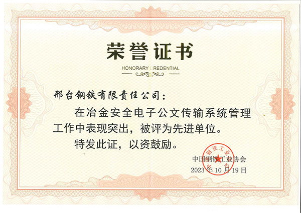 2023年10月,邢鋼在冶金安全電子公文傳輸系統(tǒng)管理工作中表現(xiàn)突出,被中國鋼鐵工業(yè)協(xié)會(huì)評為先進(jìn)單位。