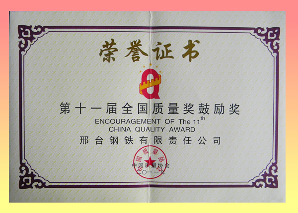 邢鋼榮獲“全國質(zhì)量獎鼓勵獎”