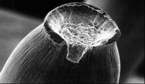 中心毛刺的斷口一般呈杯狀或者錐狀。主要是因為鋼絲拉拔過程中表面和內部受力不均導致。