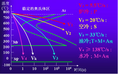 等溫轉(zhuǎn)變“TTT曲線”在連續(xù)冷卻轉(zhuǎn)變中的應(yīng)用:由于連續(xù)冷卻“CCT轉(zhuǎn)變曲線”的測(cè)定較為困難,而連續(xù)冷卻轉(zhuǎn)變可以看作由許多溫度相差很小的等溫轉(zhuǎn)變過程所組成的,所以連續(xù)冷卻轉(zhuǎn)變得到的組織可認(rèn)為是不同溫度下等溫轉(zhuǎn)變產(chǎn)物的混合物。故生產(chǎn)中常用TTT曲線(C曲線)近似地分析連續(xù)冷卻過程。下圖中V1(爐冷)、V2(空冷)、V3(油冷)、V4(水冷)代表熱處理中四種常用的連續(xù)冷卻方式。
