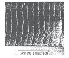 振痕是由于結(jié)晶器的周期性振動而拄鑄錠表面產(chǎn)生的間距均勻有一定深度的橫向皺折,其典型的形貌如下圖所示。
