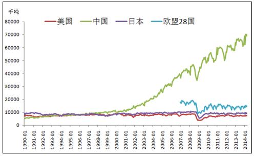 中國是鋼鐵生產(chǎn)大國,粗鋼產(chǎn)量在全球遙遙領先。自2002年開始中國開始進入經(jīng)濟飛速發(fā)展時期,粗鋼產(chǎn)量一直保持高速增長,到2013年粗鋼產(chǎn)量已達7.7億噸,約占全球產(chǎn)量的49.1%。美國,日本等鋼鐵生產(chǎn)大國,其對鋼鐵的需求已經(jīng)放緩,粗鋼產(chǎn)量一直保持穩(wěn)定狀態(tài),所以粗鋼產(chǎn)量的增長大部分來自于中國。(見圖1)