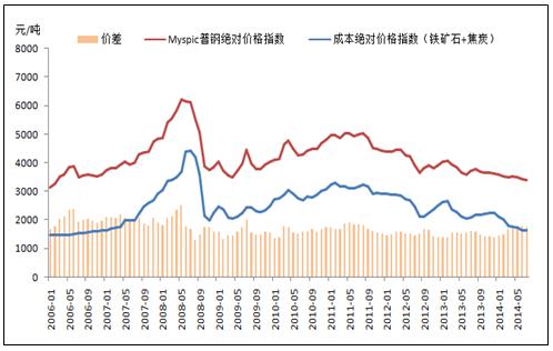 鋼鐵行業(yè)的原材料主要是鐵礦石和焦炭,近期原材料和鋼材的價格一直處于下跌狀態(tài)。截止2014年8月12日中國的焦炭絕對價格指數(shù)為931.8元/噸,同比下降19.33%;鐵礦石的絕對價格指數(shù)為699元/濕噸,同比下降27.55%;Myspic普鋼絕對價格指數(shù)為3380.68元/噸,同比下降9.8%,原材料價格下降速度遠大于鋼鐵。