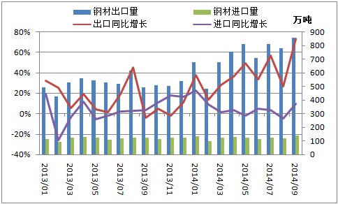 2014年9月我國出口鋼材852萬噸,創(chuàng)下歷史新高,同比大增73.2%。一方面,上年同期基數(shù)較低,導致9月鋼材出口同比增速上升明顯。另一方面,9月我國鋼材出口均價加速下跌,國際競爭優(yōu)勢明顯,進一步刺激鋼材出口。當月鋼材出口均價739美元/噸,環(huán)比下降4.9%,同比下降10.7%。