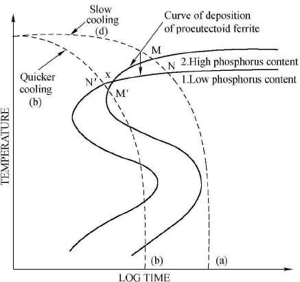 上圖曲線1、2分別是高P鋼、低P鋼的恒溫轉(zhuǎn)變曲線,也可以分別表示同一鋼中高P區(qū)和低P區(qū)的恒溫轉(zhuǎn)變曲線。在控制冷卻速率較慢的情況下,如曲線(a)所示,鐵素體將會(huì)先在M點(diǎn)形核。因?yàn)镻能夠提高C的活度系數(shù),所以高P區(qū)域C的活度較高,但實(shí)際濃度卻偏低,鐵素體的形核時(shí)會(huì)推動(dòng)C元素向低P區(qū)域、原本C濃度高(活度低)的區(qū)域擴(kuò)散,這樣就會(huì)造成C元素偏聚,形成帶狀組織;如果冷卻速率較快,如(b)所示,鐵素體會(huì)先在Nˊ點(diǎn)(低P區(qū))形核,促進(jìn)C元素向高P區(qū)域、原來(lái)C濃度較低的區(qū)域擴(kuò)散,會(huì)使C分布的更加均勻,鐵素體和珠光體都會(huì)隨機(jī)形核長(zhǎng)大,減弱或抑制帶狀組織形成。