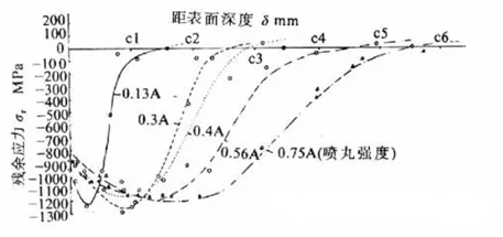 噴丸強(qiáng)化影響工件表面深度取決于工作自身強(qiáng)度,工件自身強(qiáng)度越高,影響深度越小。通常影響深度為0.1-0.8mm。下圖是高強(qiáng)鋼(σb=1900MPa)噴丸殘余應(yīng)力分布曲線,圖中可見(jiàn)噴丸強(qiáng)度由0.13Amm增高至0.75Amm,導(dǎo)致δc由0.15mm增至0.55mm,但表面殘余應(yīng)力和最大殘余應(yīng)力變化不明顯。