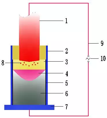 1-自耗電極;2-水冷結晶器;3-渣池;4-金屬熔池;5-渣殼;6-鋼錠;7-底水箱;8-金屬熔滴;9-變壓器;10-大電流導體