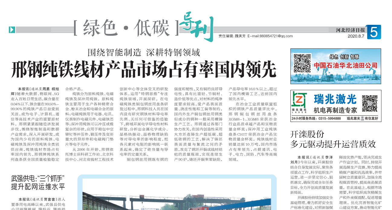 本報(bào)訊(通訊員周勇 楊旭輝)隨著大數(shù)據(jù)、物聯(lián)網(wǎng)、5G走入日常生活,碳含量在0.04%以下、鐵含量在99.50%-99.90%的純鐵產(chǎn)品日益受到關(guān)注,成為電子、計(jì)算機(jī)、通信等高技術(shù)產(chǎn)業(yè)的重要原材料。邢鋼緊緊跟隨我國經(jīng)濟(jì)發(fā)展步伐,圍繞智能制造和數(shù)據(jù)產(chǎn)業(yè)需求,深入開展研發(fā),成為國內(nèi)少有的原料純鐵、電磁純鐵及深沖用純鐵全類別供應(yīng)商,純鐵線材市場占有率國內(nèi)領(lǐng)先,邢鋼牌純鐵系列盤條獲全國質(zhì)量檢驗(yàn)穩(wěn)定合格產(chǎn)品。