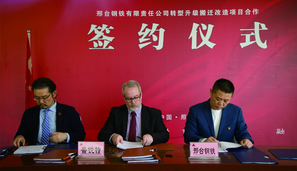 圖為普銳特冶金技術中國副總裁佐野洋一、普銳特冶金技術美國執(zhí)行COO Robert Lesage 與邢鋼董事長張育明簽訂軋機設備合同。 (普銳特冶金技術)