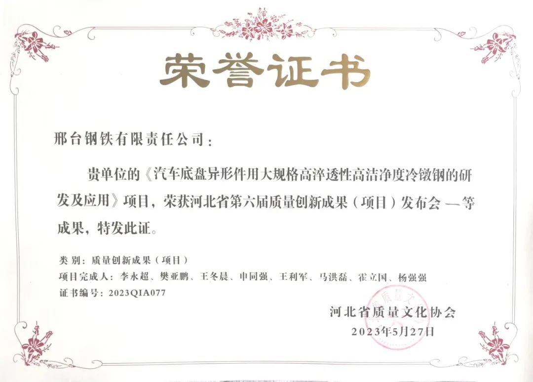 從近日召開的河北省第六屆質(zhì)量創(chuàng)新成果(項目)發(fā)布會上獲悉:邢臺鋼鐵有限責(zé)任公司(以下簡稱邢鋼)再次斬獲多項省級質(zhì)量創(chuàng)新成果殊榮,其中:《汽車底盤異形件用大規(guī)格高淬透性高潔凈度冷鐓鋼的研究及應(yīng)用》、《提高超低碳鋼成品碳含量≤50ppm比例》、《優(yōu)質(zhì)碳素鋼拉拔斷裂問題的改善與研究》榮獲示范級質(zhì)量創(chuàng)新成果;《提高6#高爐生鐵產(chǎn)量》和《全流程能效監(jiān)管系統(tǒng)的搭建與應(yīng)用》榮獲專業(yè)級質(zhì)量創(chuàng)新成果;《降低成品線材擦劃傷率》榮獲改進級質(zhì)量創(chuàng)新成果。