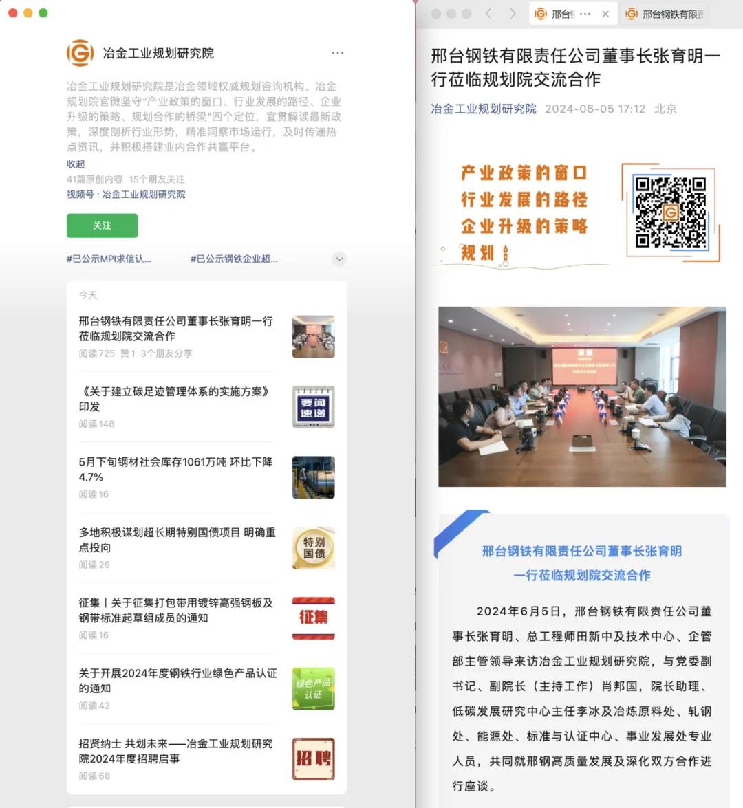2024年6月5日,邢臺鋼鐵有限責(zé)任公司黨委書記、董事長張育明在總工程師兼董事長、總經(jīng)理助理田新中及技術(shù)中心、企管部相關(guān)負責(zé)人的陪同下,到訪冶金工業(yè)規(guī)劃研究院,與黨委副書記、副院長(主持工作)肖邦國,院長助理、低碳發(fā)展研究中心主任李冰及冶煉原料處、軋鋼處、能源處、標(biāo)準(zhǔn)與認證中心、事業(yè)發(fā)展處專業(yè)人員,共同就邢鋼高質(zhì)量發(fā)展及深化雙方合作進行座談。