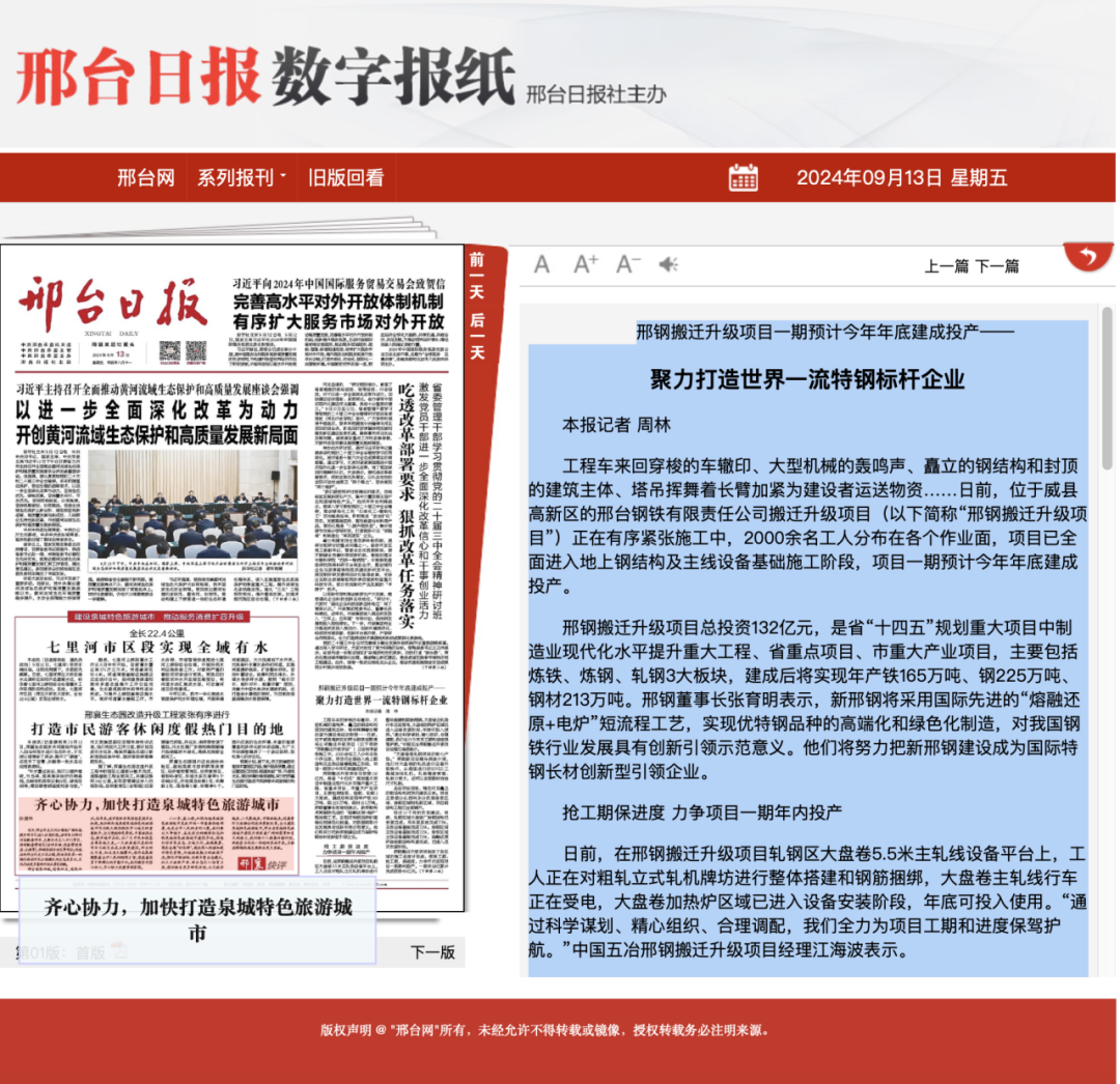 工程車來(lái)回穿梭的車轍印、大型機(jī)械的轟鳴聲、矗立的鋼結(jié)構(gòu)和封頂?shù)慕ㄖ黧w、塔吊揮舞著長(zhǎng)臂加緊為建設(shè)者運(yùn)送物資……日前,位于威縣高新區(qū)的邢臺(tái)鋼鐵有限責(zé)任公司搬遷升級(jí)項(xiàng)目(以下簡(jiǎn)稱“邢鋼搬遷升級(jí)項(xiàng)目”)正在有序緊張施工中,2000余名工人分布在各個(gè)作業(yè)面,項(xiàng)目已全面進(jìn)入地上鋼結(jié)構(gòu)及主線設(shè)備基礎(chǔ)施工階段,項(xiàng)目一期預(yù)計(jì)今年年底建成投產(chǎn)。