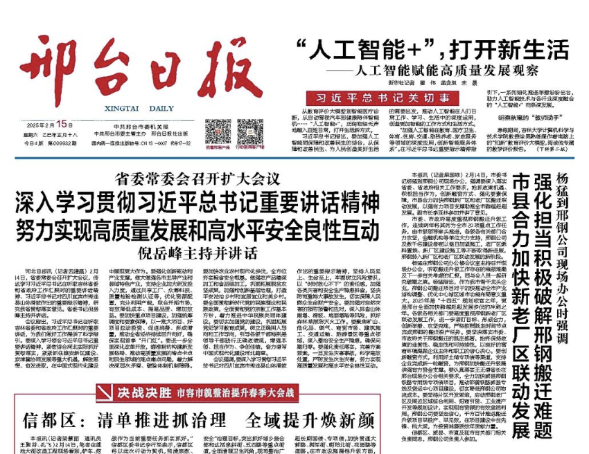 2月14日,市委書記楊猛到邢鋼公司現(xiàn)場辦公,強(qiáng)調(diào)要深入落實省委、省政府相關(guān)工作要求,搶抓政策機(jī)遇、積極擔(dān)當(dāng)作為,創(chuàng)新融資方式、強(qiáng)化要素保障,市縣合力加快邢鋼新廠區(qū)和老廠區(qū)搬遷聯(lián)動發(fā)展,以強(qiáng)有力項目支撐助推全市跨越趕超發(fā)展。副市長李亞林參加并講了意見。
